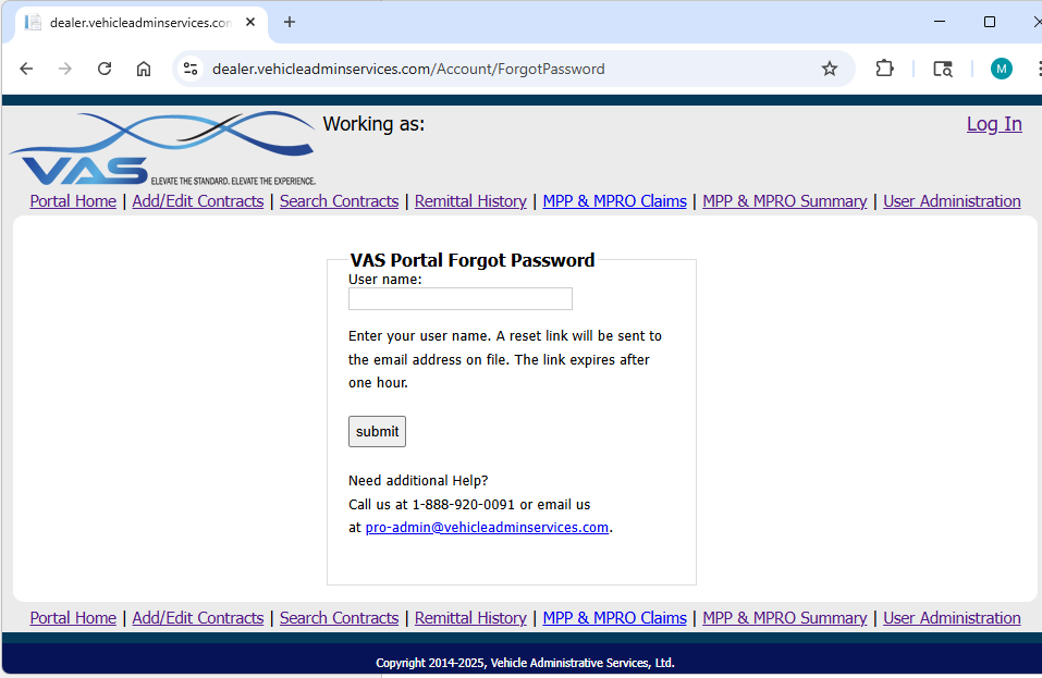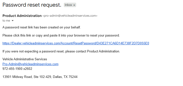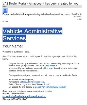 If you need access and haven't received an invitation email, please contact your local VAS administrator, your VAS sales agent, or VAS Product Administration (Pro-Admin@vehicleadminservices.com) Phone 972-455-1900.